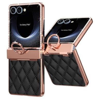 Dette stilfulde cover kombinerer funktion og elegance med en konstruktion af hård PC-plast belagt med PU-læder, som gør det modstandsdygtigt over for ridser og fingeraftryk. Det rombeformede mønster med strass og gitterstruktur giver et raffineret look. Den elektropletterede ramme tilføjer en skinnende finish, mens det hærdede glas på bagsiden beskytter skærmen mod ridser. Coveret har også hængselbeskyttelse, der beskytter enhedens bevægelige dele, samt en praktisk ringholder for bedre greb.