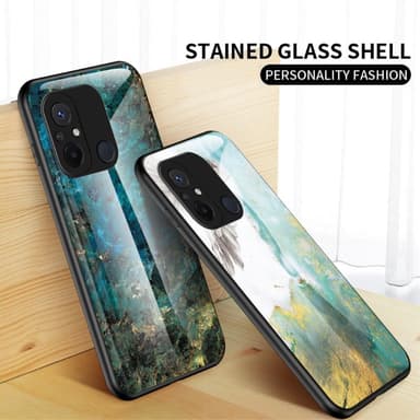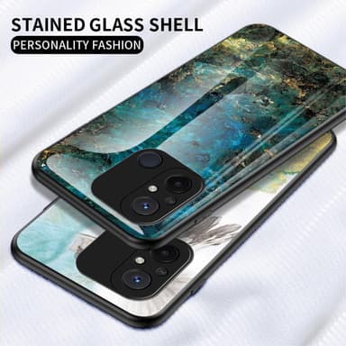 En slank TPU-cover med stilfuldt print og en bagside af hærdet glas for maksimal følelse.