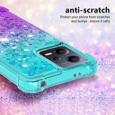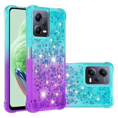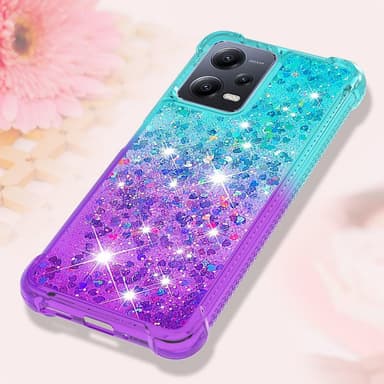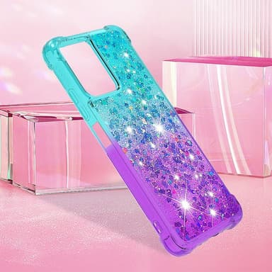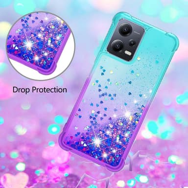 En TPU-cover med flydende væske med glitter og hjerter, der beskytter godt mod stød og faldskader.