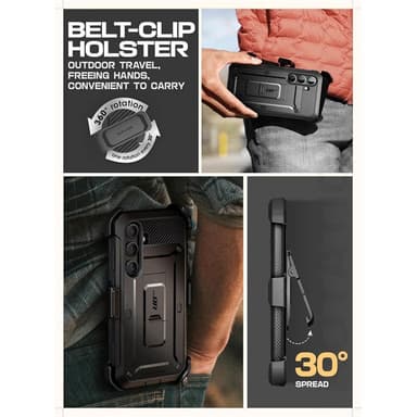 Mobilcoveret har en integreret stander, der kan foldes ud efter behov. Der medfølger også en praktisk bælteclips, så du kan fastgøre coveret til dit bælte.