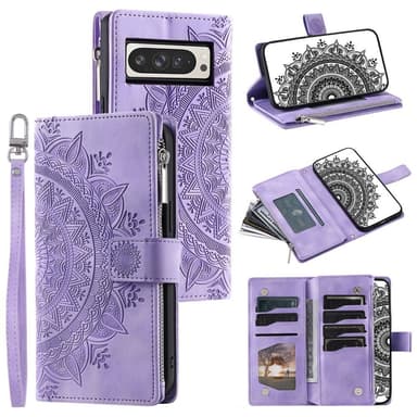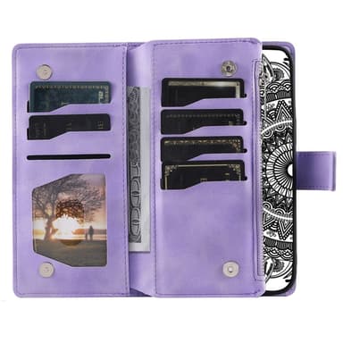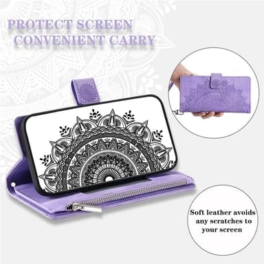 【Premiummateriale】 Dette telefoncover er lavet af premium PU-læder med TPU-interiør og tilbyder en behagelig berøring og stabil beskyttelse 【Fashionabelt design】 Præget med et elegant mandalablomstmønster tilføjer dette etui et unikt og moderigtigt touch til din telefon 【Pungfunktionalitet】 Designet med flere kortpladser, en kontantholder og en lynlåslomme gør dette etui det nemt at bære vigtige kort, mønter og kontanter 【Håndfrit stativ】 Etuiet kan foldes sammen til et stativ, perfekt til håndfri brug, mens du ser videoer eller videochatter 【Sikker magnetisk lukning】 Med en magnetisk trykknap sikrer dette etui, at din telefon, penge og kort opbevares sikkert 【Komfortabel håndledsrem】 Udstyret med en håndledsrem er dette etui let at bære og sikrer, at din telefon altid er inden for rækkevidde