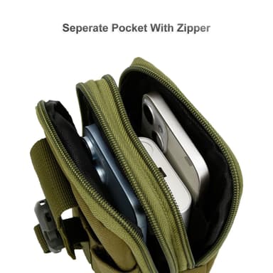 Molle-stroppen på bagsiden giver fleksible muligheder for at fastgøre tasken til et bælte, en rygsæk eller en vest. Den medfølgende skulderrem giver yderligere mulighed for at bære tasken. Denne alsidighed gør tasken til en uundværlig følgesvend.