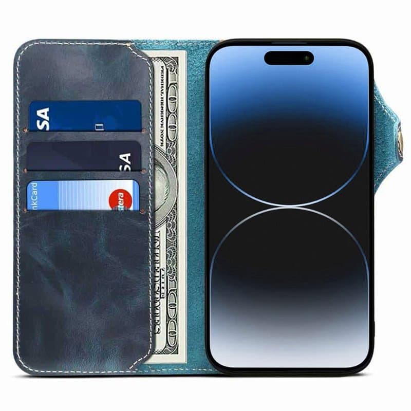 Blå Mobil tegnebog 3-kort og seddel af ægte læder til Apple iPhone 15.
