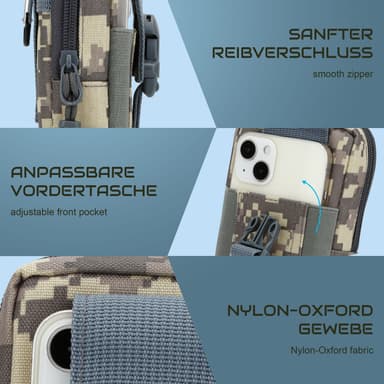 Det taktiske etui er perfekt til udendørsentusiaster. Etuiet er fremstillet af stænk- og slidstærk polyester af høj kvalitet, er robust og beskytter din telefon mod ridser og skader. Camouflage-looket giver det et stilfuldt militærdesignLæs mere om produktet