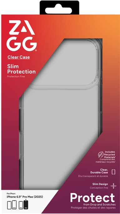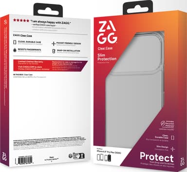 ZAGG clear case til iPhone 17 Pro Max tilbyder solid beskyttelse med gennemsigtig termoplastisk polyuretan, der passer perfekt til den 6,9-tommer skærm og fremhæver Apples design, samtidig med at den beskytter mod daglig slitage.Læs mere om produktet