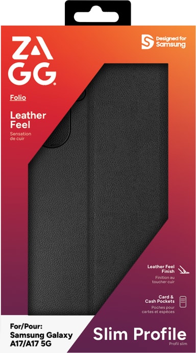 Zagg Folio Samsung Galaxy A17/A17 5G pungetuiet tilbyder elegant beskyttelse med læder-look, modstandsdygtighed over for fingeraftryk og kortlommer i et slankt, lommevenligt design med snap-on montering og stander til ideelle visningsvinkler.