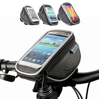 Mobiltaske til Cykel - op til 4,8 tommer Et smart foderal til din smartphone som gør at du kan kigge på din telefon mens du cykler uanset om du anvender træningsprogram, følger en vejvisning via GPS eller lytter til musik mens du cyklar, så er denne cykeltaske med fæste for montering på dit styr perfekt for dig! Desuden findes der en taske under hvor du kan have småting med dig som du kan få brug for, såsom nøgler eller en energibar. Passer telefoner / smartphones op til 4,8