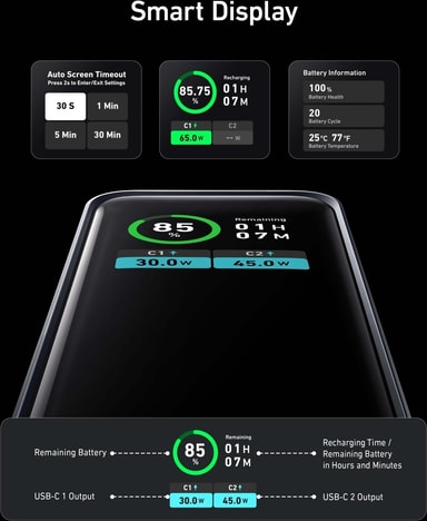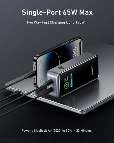 Anker Prime 130W backup-strømforsyningen er en kraftig og kompakt bærbar oplader, der giver dig utrolig hurtig opladning af alle dine enheder. Uanset om det er din bærbare computer, telefon eller anden elektronik, er denne strømforsyning et fremragende valg. Anker Prime 130W Power Bank er udstyret med to USB-C-porte, der giver op til 130 W udgangseffekt (2 x 65 W). Powerbanken har kapacitet nok til at oplade batteriet i en Apple iPhone 14 Pro to gange, og batteriet i en 13"" MacBook Air-laptop fra 2020-modellen kan oplades 0,7 gange. Prime 130 har en komplet infoskærm, som giver dig mulighed for at holde styr på oplysninger om strømstatus ved hjælp af enhedens display. Displayet viser f.eks. batteriets resterende kapacitet og USB-portenes aktuelle input/output-strøm. Displayet viser også batteriets tid under den aktuelle belastning, batteriets opladningstid, opladningscyklusser og batteriets temperatur.