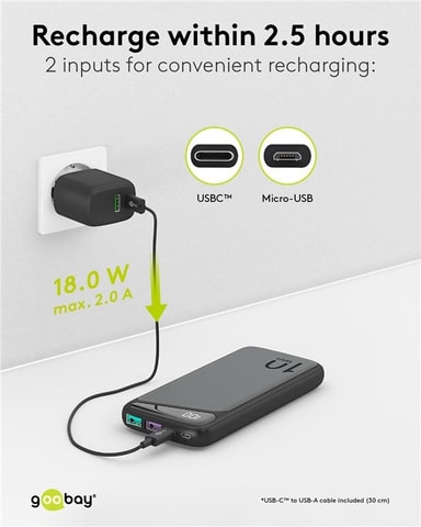 USB-C™-teknologi til hurtig opladning giver mulighed for op til 4 gange hurtigere opladning af powerbanken og tilsluttede enheder sammenlignet med konventionelle powerbanks.