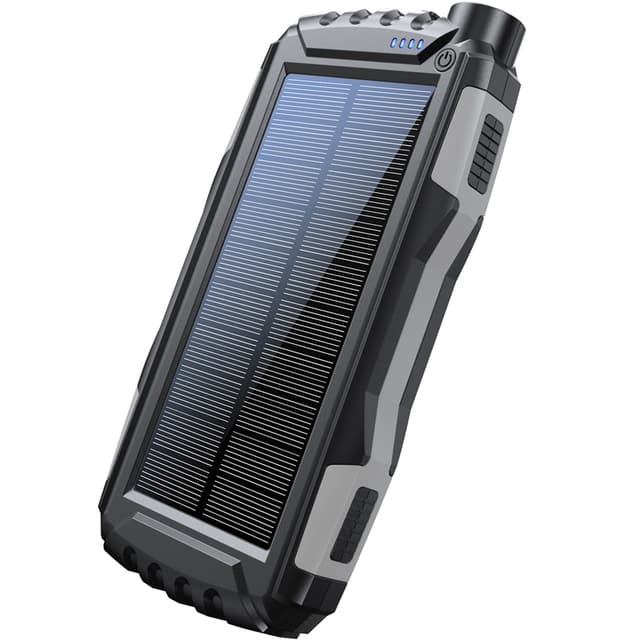 En solcellspowerbank med 20.000mAh batteri och dubbel USB-utgång.