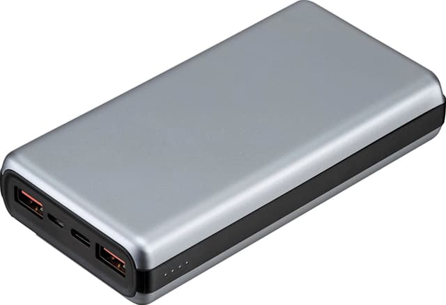 Sandstrøm 20.000 mAh powerbanken i aluminium med Power Delivery og Quick Charge 3.0 tilbyder 2x USB-A 3.0 og 1x USB-C connector. Den kan oplades via microUSB-connector. Maks. output 18 W.