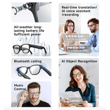 AI-drevet assistance: Oplev kraften i AI lige foran dine øjne. Disse briller har en indbygget AI-stemmeassistent, der kan hjælpe dig med realtidsoversættelse, objektgenkendelse og endda give dig svar på dine spørgsmål. Bare spørg, og brillerne vil give dig de oplysninger, du har brug for. Forestil dig at kunne oversætte et fremmedsprog i realtid, identificere en plante eller et dyr, du ser, eller få svar på et trivia-spørgsmål, alt sammen uden at skulle tage din telefon frem. Disse smarte AI-briller er din personlige assistent, der altid er klar til at hjælpe.