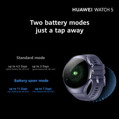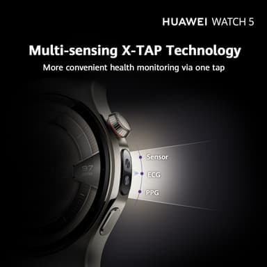 Huawei Watch 5 har 3-i-1 X-TAP sundhedsovervågning med EKG, SpO2 og trykmålinger i en sensor. Det er lavet af kvalitetsmaterialer, har op til 11 dages batteri i ultra-long tilstand. Stilfuldt, holdbart og kompatibelt med iOS/Android.Læs mere om produktet