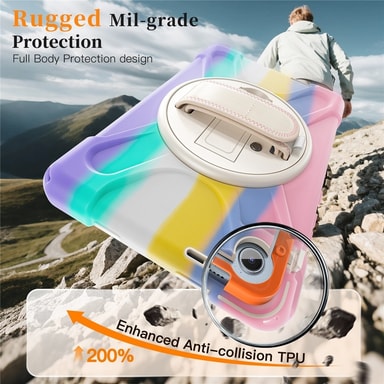 Armor 360 Håndtag Skulderrem er et slidstærkt og alsidigt beskyttelsescover, der kombinerer funktionalitet med holdbarhed. Med et 360 graders roterbart stativ kan du nemt justere visningsvinklen og sikre grebet med den justerbare håndrem. De forstærkede, hule hjørner i tyk silikone giver ekstra stødabsorbering og beskytter din enhed ved fald fra op til en meter på cement. Coveret er fremstillet i en hybridkonstruktion med slidstærk silikone, hårdt PC-inderskal og TPU-kanter for at modstå vibrationer og ridser. Den justerbare skulderrem gør det nemt at bære enheden, også i bilen. Stativet understøtter to forskellige vinkler for optimal visning uanset aktivitet.