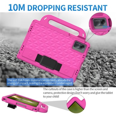 Fremstillet af miljøvenligt og giftfrit EVA-materiale, som giver sikker beskyttelse til børn. Det stødabsorberende og slagfaste design gør det ideelt til legende omgivelser. Den unikke rhombus-tekstur kombineres med et praktisk stativ til håndfri visning. Håndtaget gør det nemt at bære, og et indbygget rum holder stylus-pennen på plads (pen medfølger ikke). Nem adgang til alle funktioner, og den medfølgende skulderrem giver ekstra bekvemmelighed.