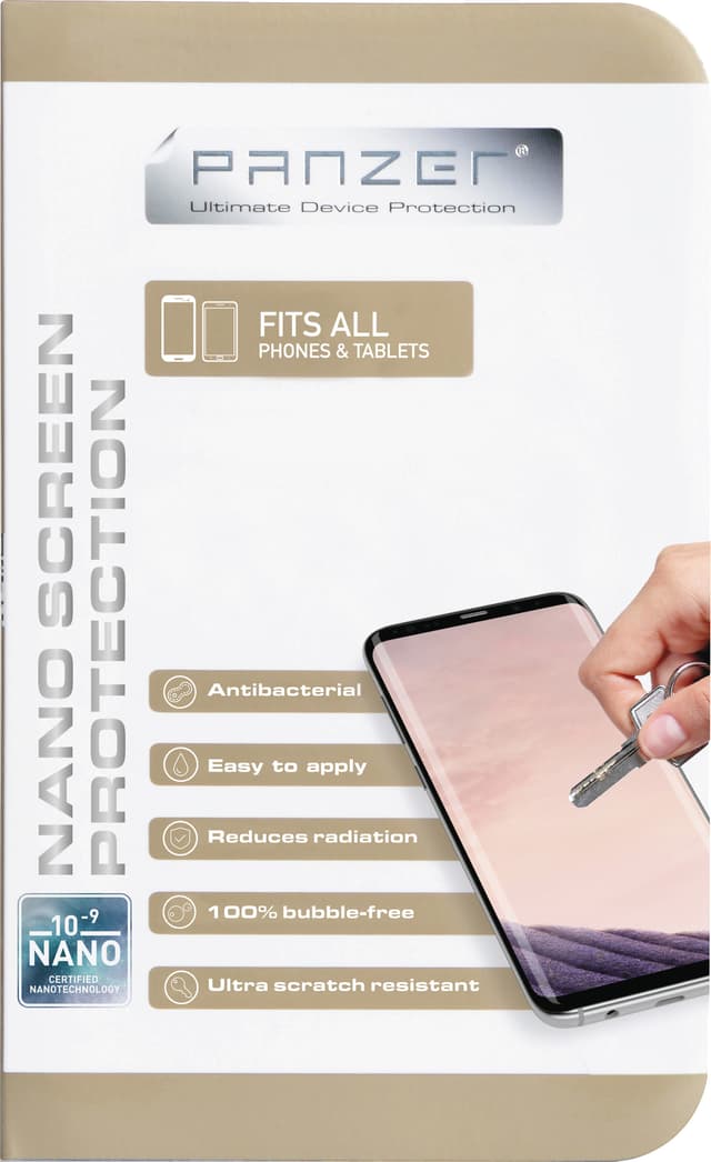 Den universelle Panzer Nano skærmbeskytter til smartphones og tablets yder perfekt væskebeskyttelse, passer til alle smartphones og tablets og har 3 beskyttende lag. Beskytteren har 9+ hårdhed, er ridseresistent og dræber aktivt bakterier. Desuden reducerer den telefonens stråling med op til 90%.