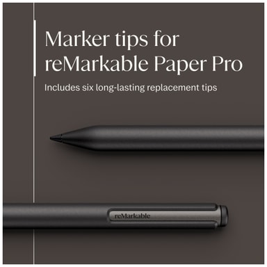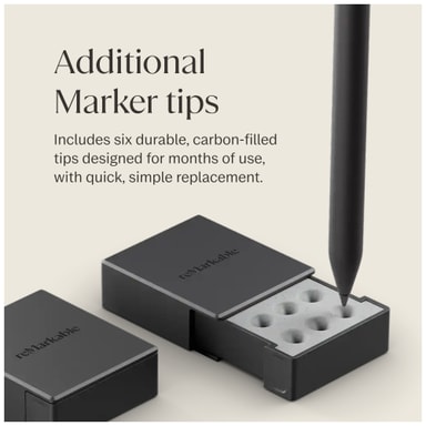 Den helt nye Marker er designet med lang levetid i tankerne og er udstyret med seks ekstra spidser, anbragt i en praktisk Marker-spidsboks til ubesværet udskiftning. De kulstoffyldte spidser er konstrueret til at holde dobbelt så længe som dem, der bruges til reMarkable 2, hvilket sikrer, at din skrivning forbliver skarp og konsistent over tid.