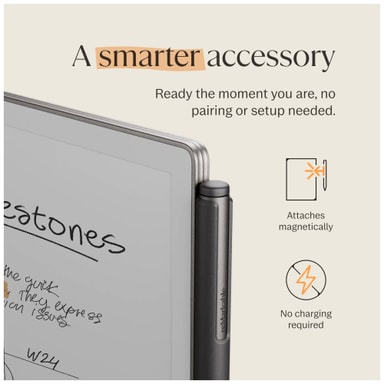 ReMarkable Paper Pro Marker Plus stylus giver dig mulighed for at låse op for din kreativitet og opnå næste niveau af produktivitet. Nyd avanceret notetagning og skitsering med upåklagelig præcision, og oversæt din hånds bevægelser til smukke kunstværker. Den fastgøres magnetisk til din enhed, og dens drift er batterifri. (Kun kompatibel med reMarkable Paper Pro - fungerer ikke på andre reMarkables).