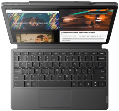 Dette Lenovo Tab P11 Pro (2nd Gen) 2-i-1 tastatur og stander giver praktisk anvendelighed og bærbarhed i ét. Tilt din tablet med støttebenet, og oplev komfort og snilde fra det ergonomiske tastaturs U-formede design og de 12 funktionstaster.Læs mere om produktet