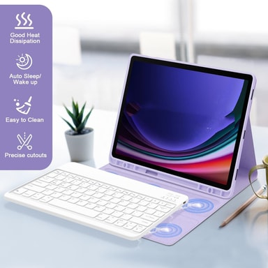 Praktiske funktioner: Dette tastaturcover er fyldt med praktiske funktioner til at forbedre din brugeroplevelse med din Samsung Galaxy Tab S7 FE 5G 12,4 tommer. Sleep/wake-funktionen sætter automatisk din tablet i dvale, når coveret lukkes, og vækker den, når det åbnes, hvilket sparer batterilevetid. Det hurtige varmeafledningsdesign forhindrer din tablet i at overophede under længere brug. Den let rengørbare overflade sikrer, at dit cover altid ser bedst ud. Med en batterikapacitet på 280mAh tilbyder tastaturet cirka 40 timers brugstid på en enkelt opladning, hvilket gør det ideelt til rejser og brug på farten.
