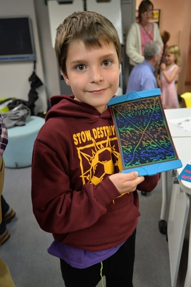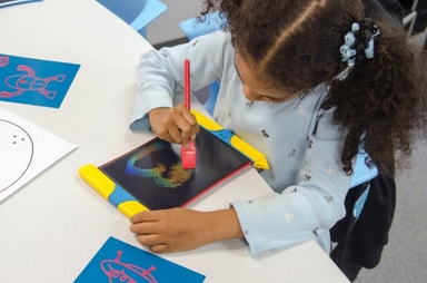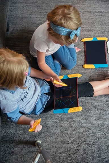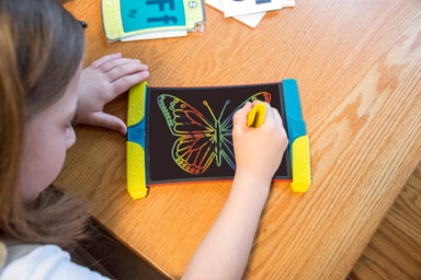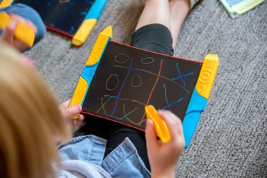 Boogie Board Scribble and Play tabletten lader dine børn nyde oplevelsen af at tegne og lave kruseduller overalt. Skærmen er let at betjene og kan viskes ren med et tryk på en knap. Det hårdføre design styrkes af en stødresistent ramme.Læs mere om produktet