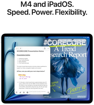 11" iPad Air. Bygget til Apple Intelligence.1 iPad Air, nu med superkræfter fra Apple M4-chippen. Fuld power til en venlig pris. Den har en smuk Liquid Retina-skærm, et 12 MP Center Stage-kamera på forsiden til videoopkald i høj kvalitet, iPadOS og hæsblæsende hurtig Wi Fi 72 og 5G.3 Og den fungerer med bl.a. Apple Pencil Pro og Magic Keyboard til iPad Air, så du let og effektivt kan multitaske, studere, arbejde, spille og være kreativ.