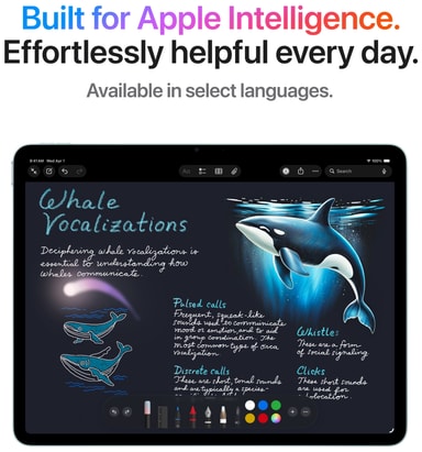 - HVORFOR VÆLGE IPAD AIR? – iPad Air med Apple M4-chippen er pakket med ekstraordinær ydeevne i et smukt design og fås i to bærbare størrelser. Den har Apple Intelligence,1 en smuk Liquid Retina-skærm, Touch ID, avancerede kameraer og Wi-Fi 7.2