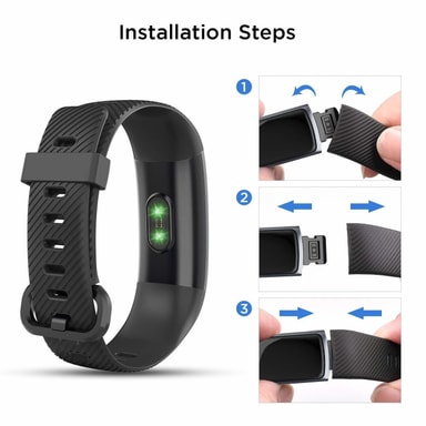 Nem montering: Intet værktøj nødvendigt, træk armbåndet forsigtigt af aktivitetsmåleren, og skub udskiftningsremmen ind.