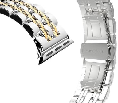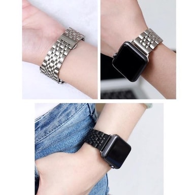 Et ledarmbånd til Apple Watch Series 1-3 42mm med fem led. Armbåndet er lavet af rustfrit stål, hvilket giver et eksklusivt udseende og følelse.