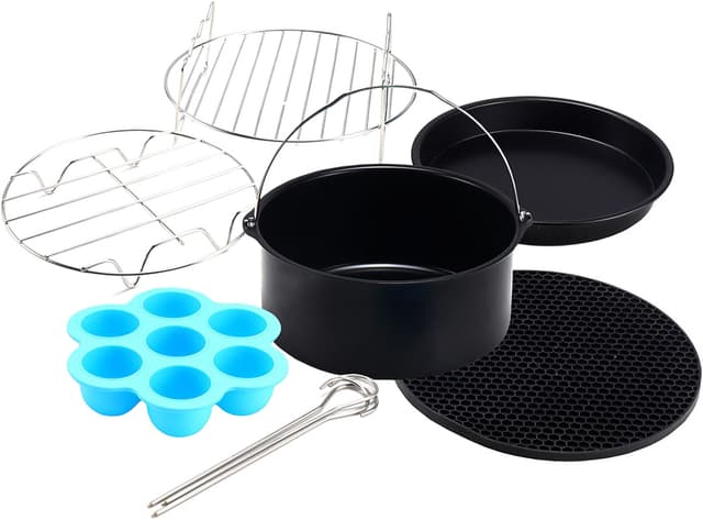 Equip air fryer-tilbehørssættet indeholder 6 dele: en kagekurv, en pizzapande, en silikonemåtte, 7 muffinsforme, en metalholder, et spydstativ og fire spyd. Alt dette tilbehør tåler opvaskemaskine og er fremstillet af silikone og kulstofstål.Læs mere om produktet