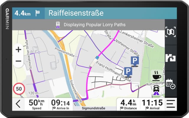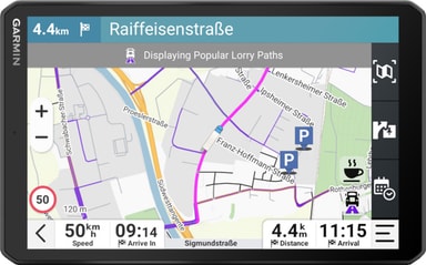 GPS'en har et væld af funktioner, som hjælper dig på vej. Takket være ruteoversigten med vejropdateringer og vindhastighed på din destination og langs din rute er du altid forberedt på skiftende situationer. Du kan tjekke populære lastbilruter for at være mere opmærksom i ukendte områder, mens den brugerdefinerede lastbilrute vælger den bedste vej til din destination, undgår broer og forhindringer, som din lastbil er for stor til at passere, og advarer dig om skarpe kurver, stejle stigninger og meget mere. Miljøzone-routing giver vejledning og advarsel, mens du kører, så du altid ved, hvordan du skal køre i bestemte områder. Den medfølgende BirdsEye-satellitteknologi giver overblik over din destination, og derudover leveres GPS'en med Truck Parking Europe, så du kan filtrere dem efter faciliteter.
