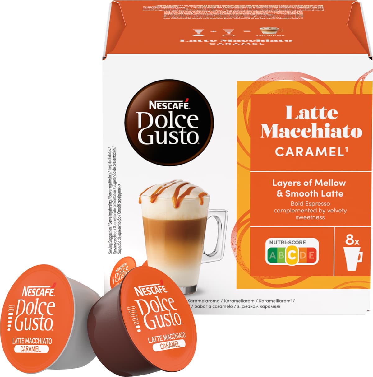 NESCAFÉ Dolce Gusto Caramel Latte Macchiato er en karamelinfunderet mælk afbalanceret med en blanding af ren premium Arabica og Robusta. Du får også en blød kaffesmag, da det er en espresso latte macchiato, som er mere mælkefremadrettetLæs mere om produktet