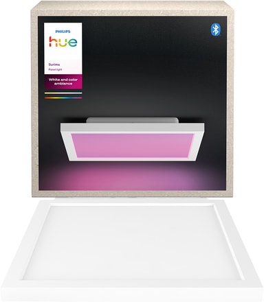 Philips Hue Surimu firkantede panel tilbyder millioner af farver. Det giver en række farver fra varm hvid til køligt dagslys. Det er kompatibelt med Philips Hue-appen og Philips Hue Bridge.Læs mere om produktet