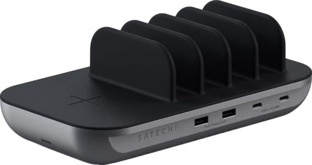 Denne Satechi trådløse opladerstation giver et praktisk opladningssted til alle dine enheder. To USB-C-porte med hurtigopladning og to USB-A-porte kombineret med en Qi-kompatibel trådløs oplader kan rumme alle dine enheder. Oplad op til 5 enheder på én gang, og hold dem organiseret takket være silikoneinddelerne.