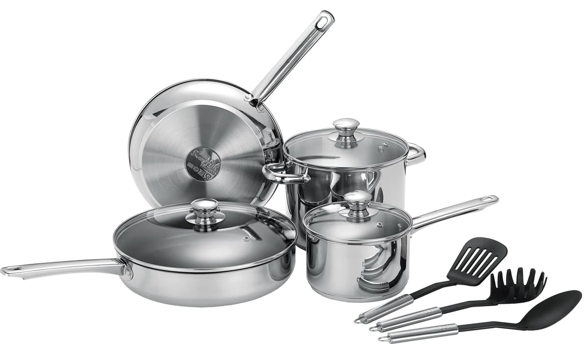 Køkkengrejssættet i rustfrit stål består af 10 stykker egner sig til alle former for kogeplader. Indeholder 4 pander og gryder, 3 låg og 3 køkkenredskaber.Læs mere om produktet