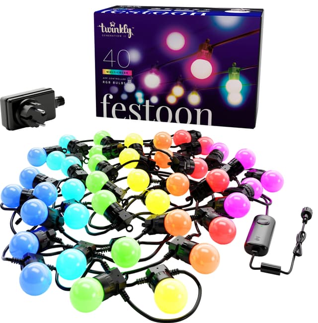 De 40 RGBG45-pærer skaber en kæde af dæmpbare lys, der kan skifte mellem 16 millioner forskellige farver. Få den rigtige stemningsbelysning på det rigtige tidspunkt.
