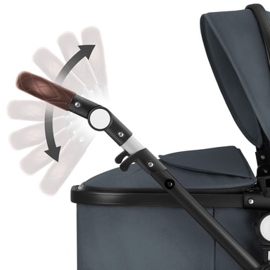 Skubbehåndtaget i elegant læderlook kan justeres i højden i 4 trin og tilpasses enhver kropshøjde, mens den praktiske håndledsrem giver endnu mere sikkerhed og forhindrer utilsigtet rullende væk. Den med lynlås aftagelige kaleche kan foldes i 5 trin afhængigt af vejret, så din lille også er godt beskyttet på solrige udflugter.