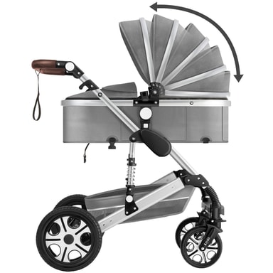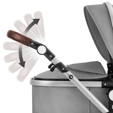 Skubbehåndtaget i elegant læderlook kan justeres i højden i 4 trin og tilpasses enhver kropshøjde, mens den praktiske håndledsrem giver endnu mere sikkerhed og forhindrer utilsigtet rullende væk. Den med lynlås aftagelige kaleche kan foldes i 5 trin afhængigt af vejret, så din lille også er godt beskyttet på solrige udflugter.