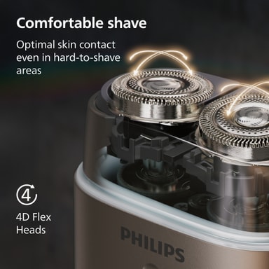 Barbermaskinen har dobbelte SteelPrecision-blade, der klipper hår effektivt i alle retninger, kombineret med 4D flex-hoveder, der følger ansigtets konturer.