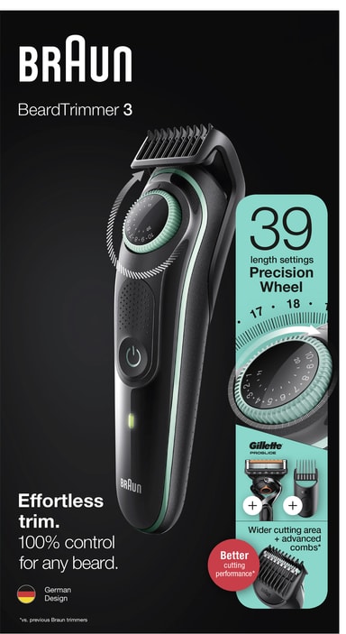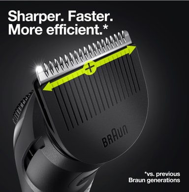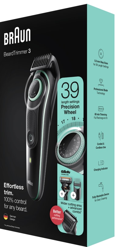 Med Braun skægtrimmeren BT3341 kan du vedligeholde og sætte dit skæg og hår, som du vil. Med et bredere skærehoved end tidligere Braun-modeller kan trimmeren opfange mere hår, så trimningen går hurtigere. præcisionsskiven med 39 længdeindstillinger gør det nemt at vælge skæggets og overskæggets længde og stil. Brug skægtrimmeren med ledning eller uden ledning i op til 80 minutter og hold den nemt ren takket være det fuldt ud vaskbare design.