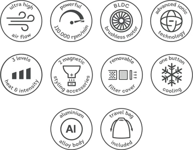 Motor: Hårtørreren drives af en 1800W BLDC børsteløs motor.