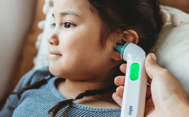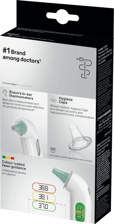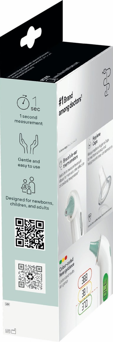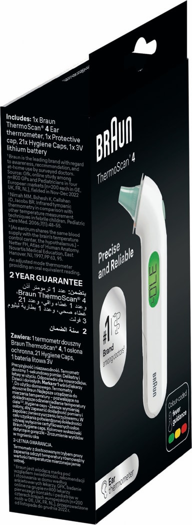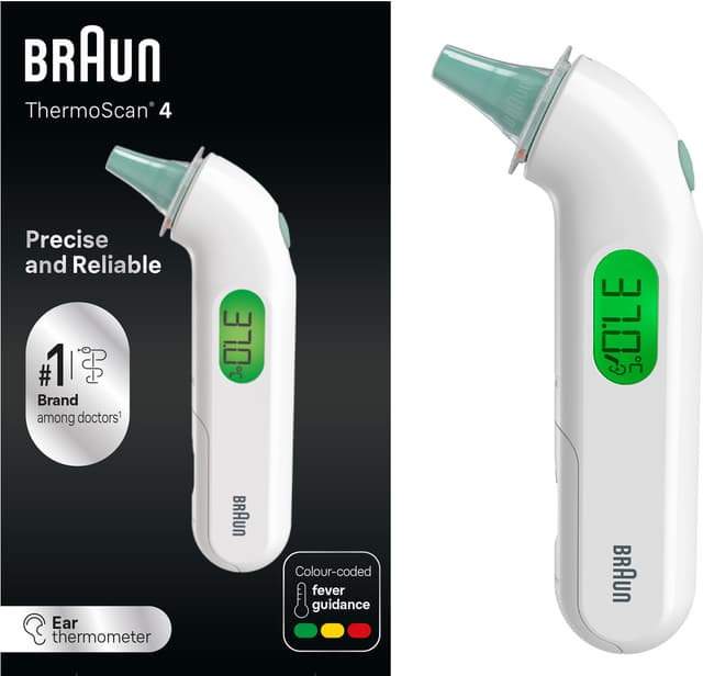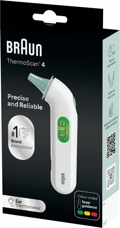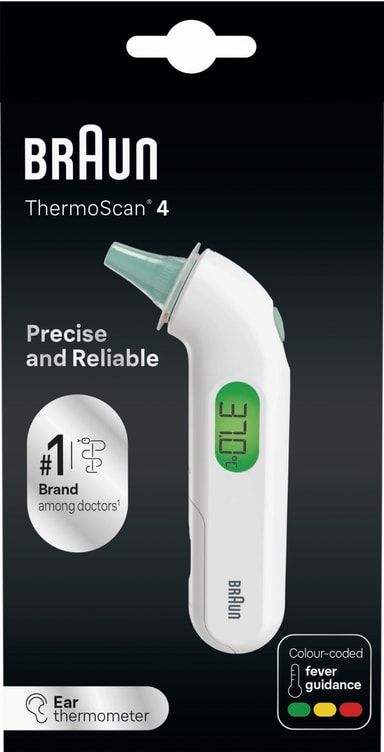 Dette Braun ThermoScan 4 febertermometer IRT3515EE er et hurtigt digitalt øretermometer til alle aldre, der giver aflæsninger efter 1 sekund med et farvekodet feberdisplay, hukommelsesfunktion og mulighed for måling i Celsius eller Fahrenheit.Læs mere om produktet