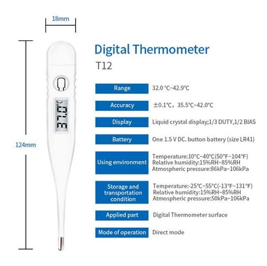 Hurtig og nøjagtig beregning: Det digitale termometer er baseret på en optimeret algoritme, der fortæller din kropstemperatur inden for 15 til 30 sekunder efter brug og på en nøjagtighed med en forskel på 0,1 ° C. Giver et resultat på kropstemperaturen mellem 32 ° C og 49 ° C. Termometeret afgiver en klar lyd, når enheden har aflæst kropstemperaturen. Kan også bruges på dyr!