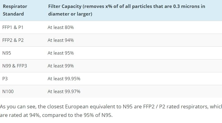 I mange lande arbejder man med N95-masker som disse. I Danmark vil de være kendt som FFP2 masker. De er identiske i deres filtreringsgrad. Masken filtrerer altså tæt på 95% af alle partikler inden for en vis størrelse. En FFP2-maske filtrerer lige under 95% af partiklerne.