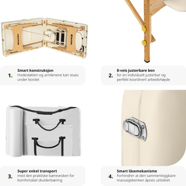 En af de mange fordele ved vores massagebriks er dens transportable design. Den er nem at klappe sammen og kommer med en praktisk transporttaske, hvilket gør den ideel at tage med dig, uanset hvor du er. Du kan let justere højden fra 65 cm til 90 cm, hvilket gør denne briks yderst fleksibel og brugervenlig.