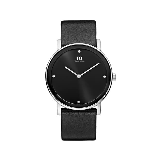 Et smukt ur fra danish design der har en kasse i rustfrit stål med sort skive, fire zirkoner, mineral krystal glas og en sort læderrem. Det perfekte ur til enhver lejlighed.