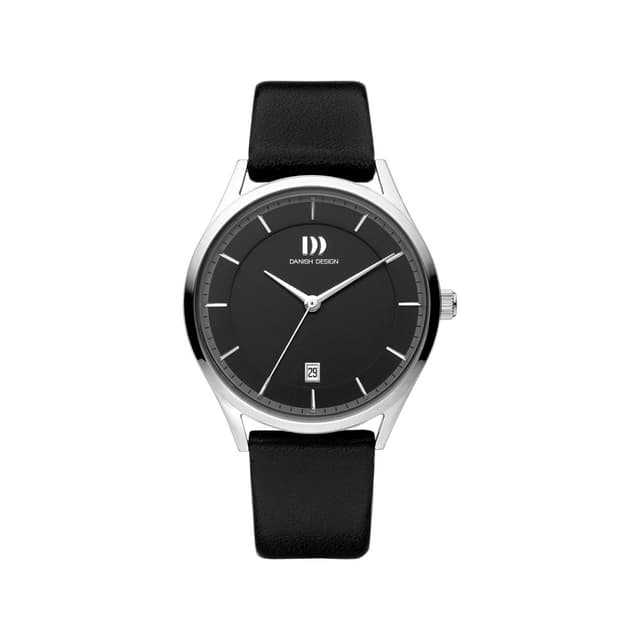 Simpelt og klassisk på en helt ny måde. Dette ur fra danish design har en kasse i rustfrit stål med sort skive, datodisplay, mineral krystal glas og en sort læderrem.