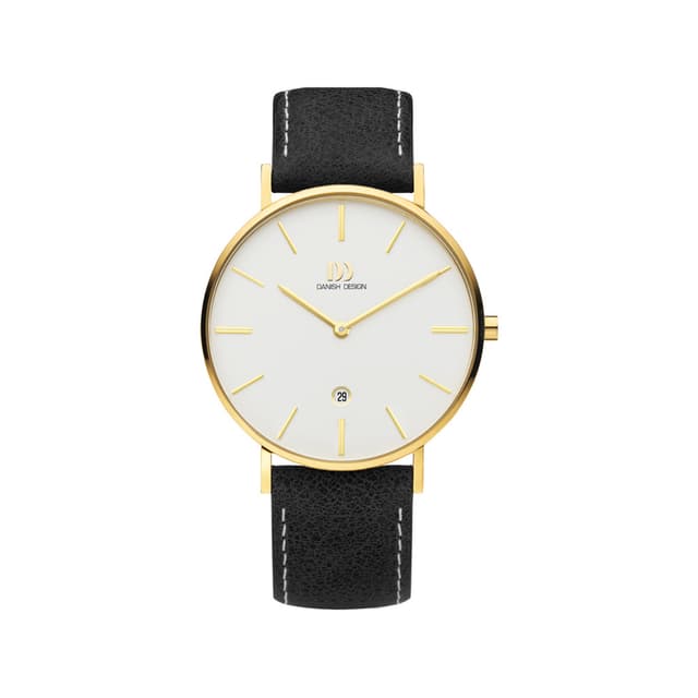 Simpelt og klassisk på en helt ny måde. Dette ur fra danish design har en guldfarvet kasse i rustfrit stål med hvid skive, datodisplay, mineral krystal glas og en sort læderrem.