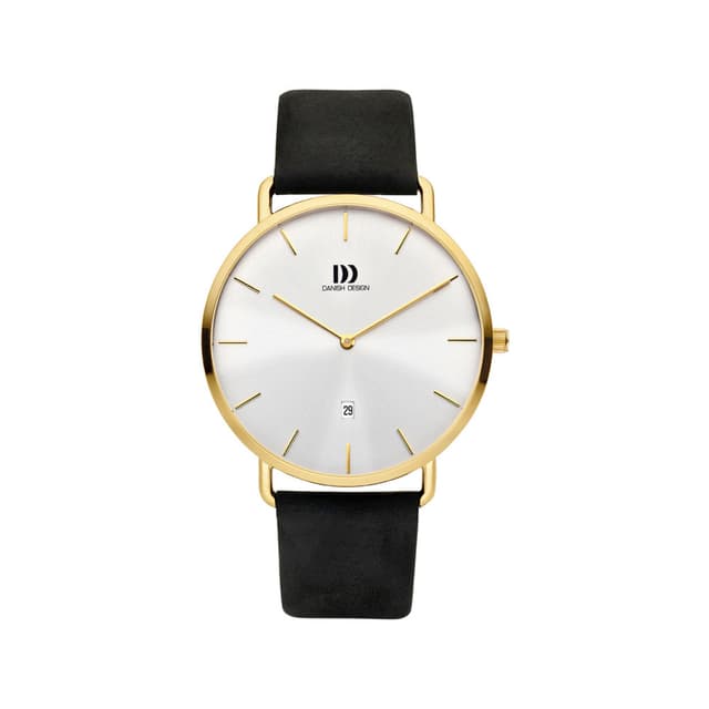 Perfekt til ethvert outfit. Dette simple ur fra danish design har en guldfarvet kasse i rustfrit stål med hvid skive, datodisplay, mineral krystal glas og en sort læderrem.