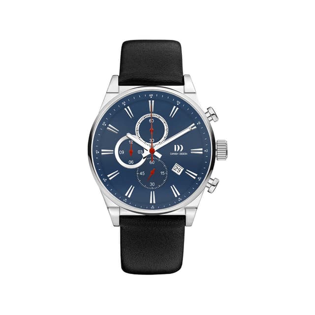 Dette kronograf ur fra danish design giver dig en helt ny kontrol mens du samtidig kan se godt ud. Uret har en kasse i titanium med blå skive, datodisplay, mineral krystal glas og en sort læderrem.